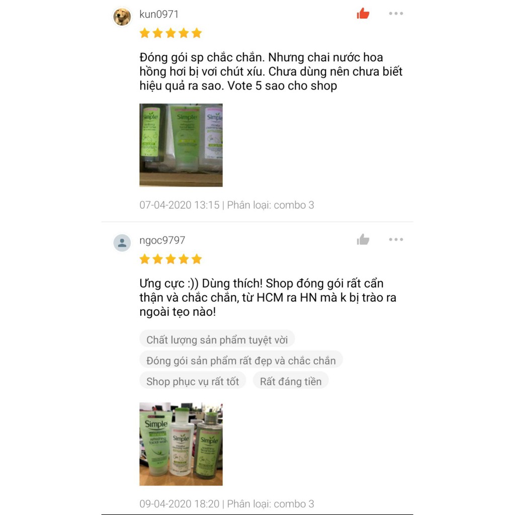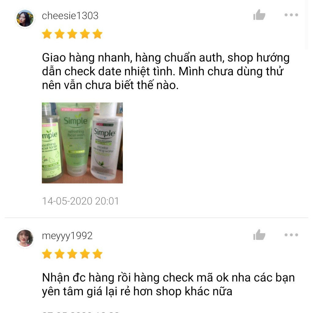 Miễn phí đổi trả nếu bán hàng kém chất lượng. Hiện tại [Mã SKAMPUSH10 giảm 10% đơn 200K] COMBO LÀM SẠCH SIMPLE TẨY TRANG + SỮA RỬA MẶT + NƯỚC HOA HỒNG đang được giảm giá chỉ còn 240,870đ. Số lượng có hạn hãy nhanh tay đặt khi còn hàng bạn nhé